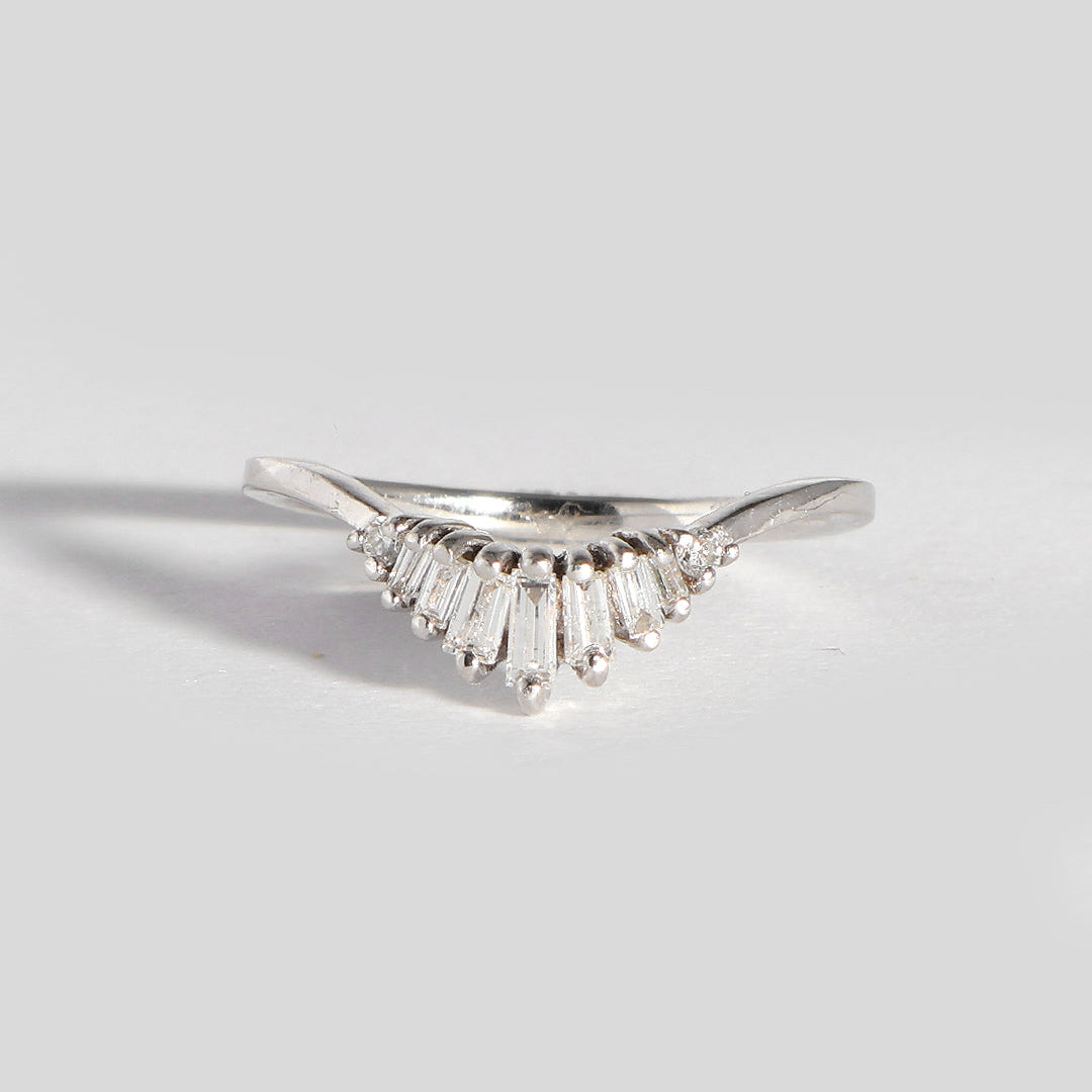 churumbela curva, fabricada en oro blanco de 14k con 0.3 ct. de diamantes totales en corte baguette con un color grado (F-H) y claridad (VS-SI)