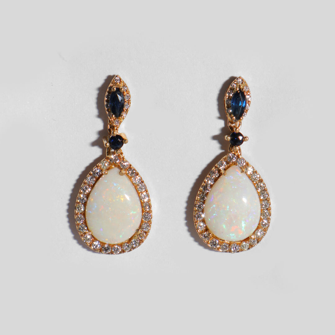 Arete colgante fabricados en oro amarillo de 14k ópalos con un total de 5.30 ct, un total de 0.79 ct de diamantes con un color grado (G-H) y claridad (VS-SI) y un total de 0.44 ct de zafiros fabricados en oro amarillo