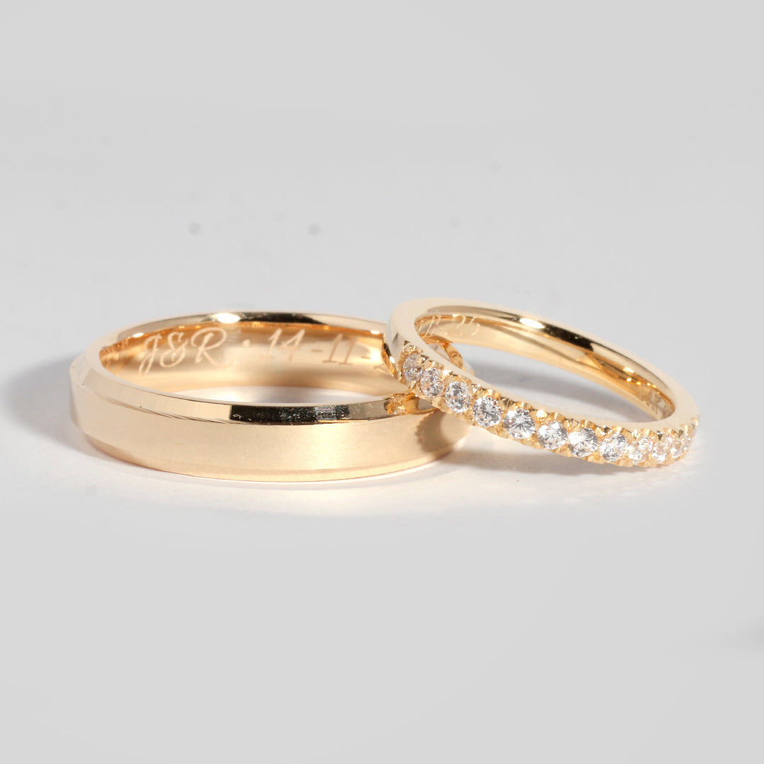 Argolla para caballero modelo Malli en amarillo de 5 mm Argolla para dama modelo Iskra con 0.33 ct de diamantes