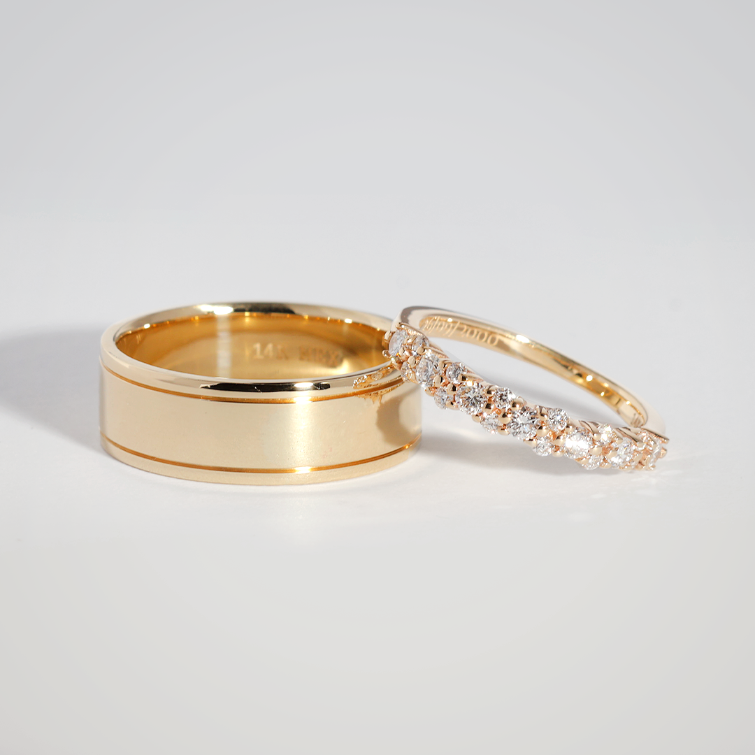 Argolla de Caballero modelo Era 6 mm en oro amarillo de 14kChurumbela para Dama modelo Vanessa con 0.50 ct de diamantes en oro amarillo de 14k