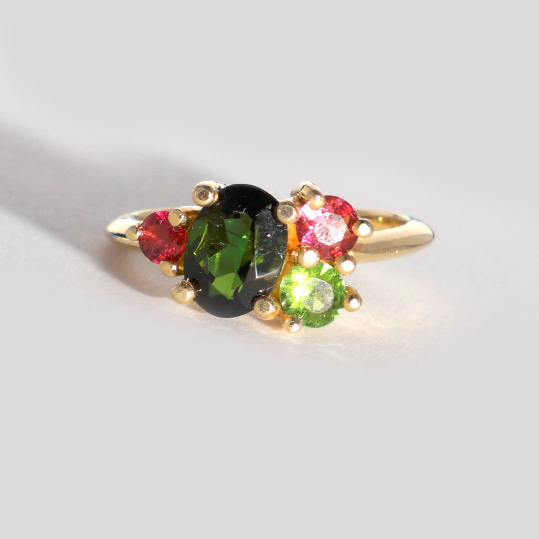 Anillo de Compromiso de tres piedras, oro amarillo de 14k con turmalinas de un kiltaje total de 1.76 ct. Anillo 100% hecha a mano con amor por Artesanos y Orfebres Mexicanos.