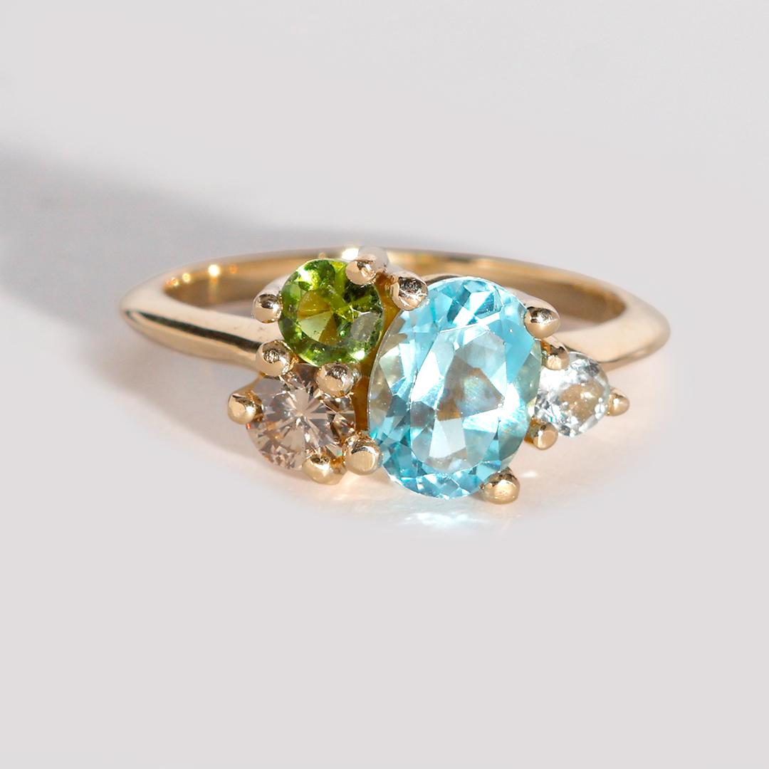 ANILLO CLUSTER CON GEMAS TOPACIO 1.59 DIAMANTE CHAMPAGNE 0.24 PERIDOTO 0.17 AGUAMARINA 0.10Oro de 14K