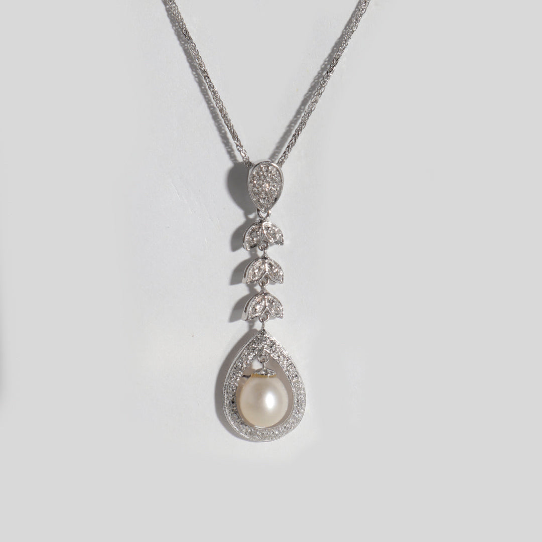 Juego de aretes y gargantilla con perlas y diamantes (0.50 ct) (H-I, SI-I), fabricado en oro blanco de 14k